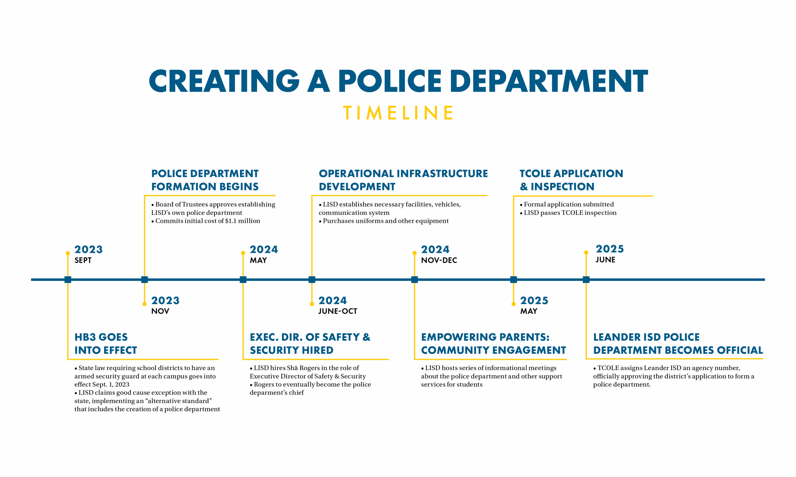 In 2023, the Board of Trustees authorized the creation of a district police department to serve Leander ISD students, staff, and the broader community. The Leander ISD Police Department was officially established in July 2025.